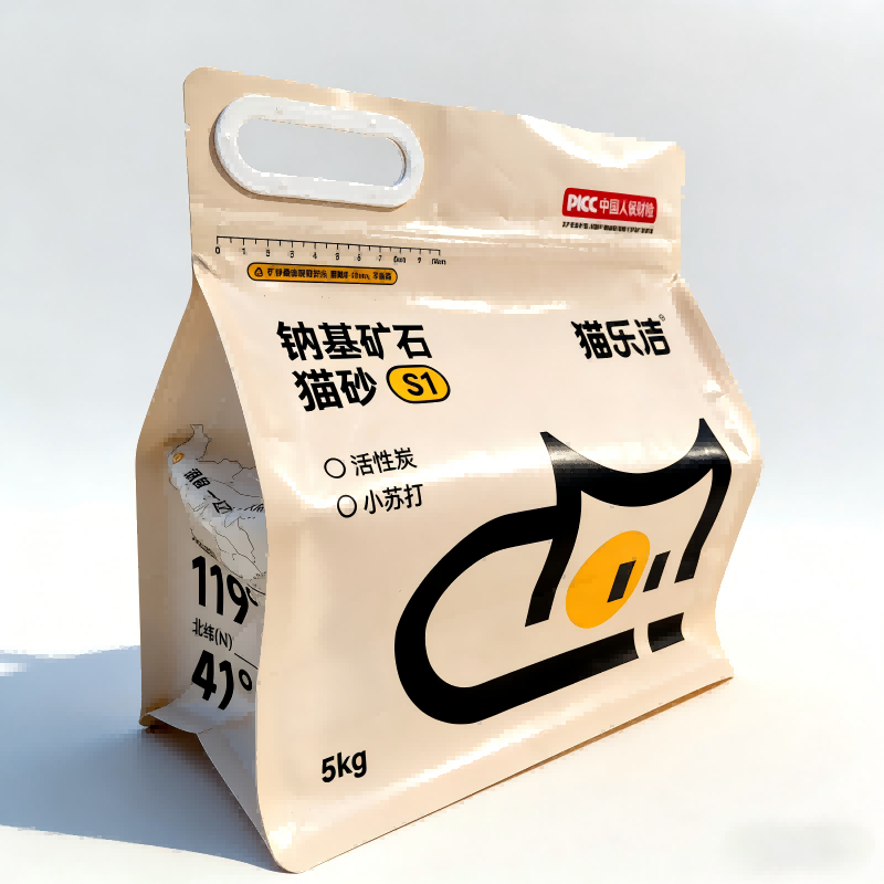 Сөмке құрылымы: сегіз жақты тығыздағыш құрылымы тік, тұрақты пішінді қамтамасыз етеді, сөрелерді көрсетуге өте ыңғайлы. Қайта жабылатын найзағай және күшейтілген пластик қол ұстағышы 5 кг мысық қоқысын оңай ұстауға және қауіпсіз сақтауға мүмкіндік береді.